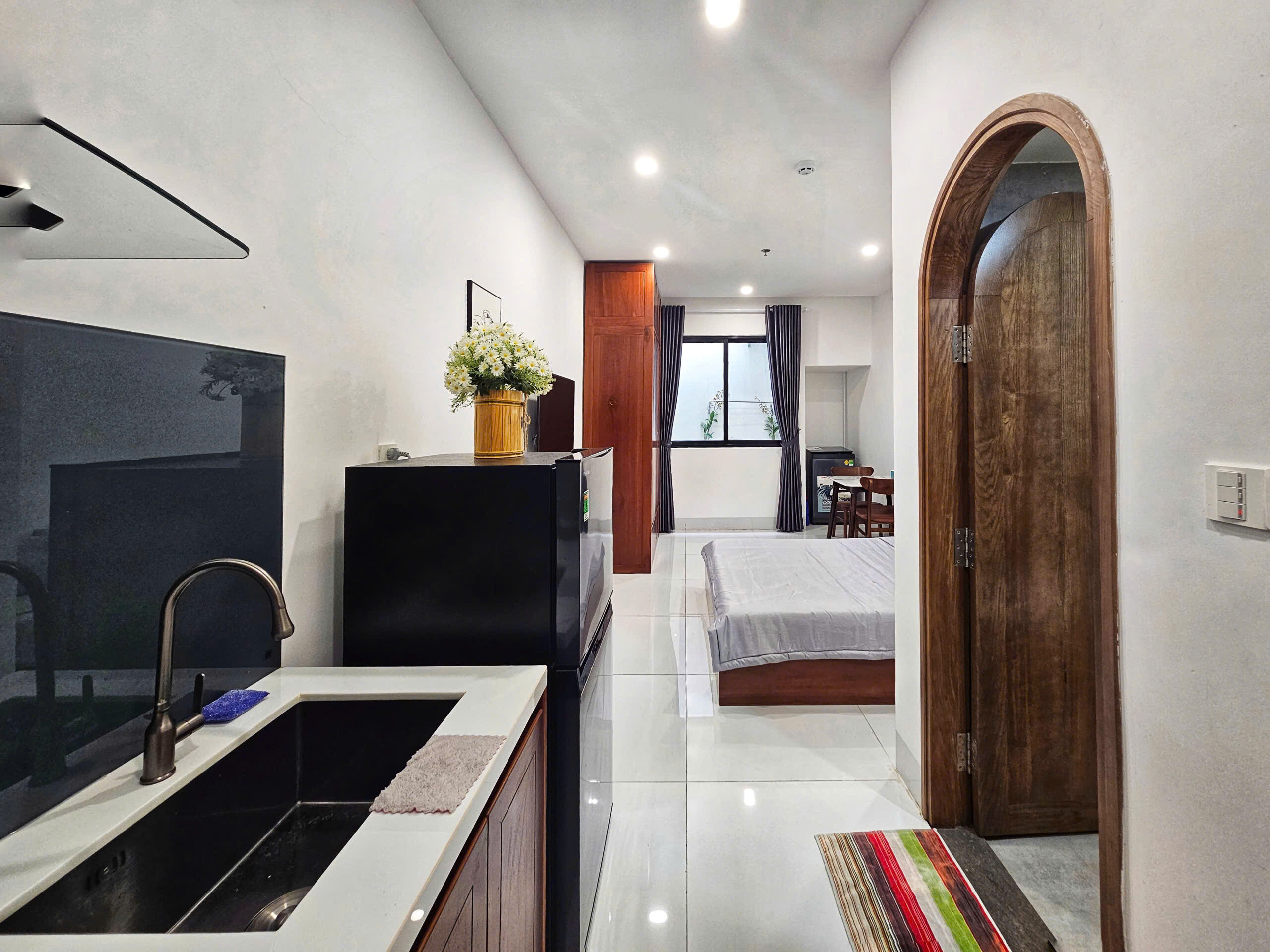 Mỗi căn hộ được trang bị đầy đủ nội thất bếp (tủ lạnh, bếp nấu, dụng cụ cơ bản), cho phép bạn thoải mái tự chuẩn bị những bữa ăn ấm cúng như tại nhà.